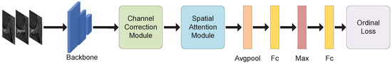 As shown in Figure 2, the network framework consists of four parts: a backbone network, a channel correction module, a spatial attention module, and an ordinal loss function. A backbone network is used to extract features from the doctor-labeled slices, turning the data of size into a feature map of size , where denotes the number of images of the ith patient annotated and denote the dimensionality and size of the feature map. The feature maps are channel-corrected and then weighted by a spatial attention mechanism. The weighted feature maps are fed into the pooling and fully connected layers to obtain the vectors. In order to combine the information of multiple slices of the same person, the top feature at each position is taken as the representative feature for all slices, i.e., a vector of size is obtained by taking the maximum value, according to the conclusion of Su et al. [43]. Finally, the ordinal loss is used to train the fully connected layer’s classification results.