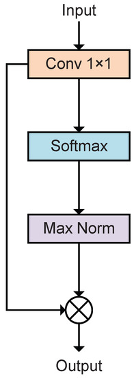 where denotes the convolution layer and and denote the feature maps before and after being weighted. Equations (2)–(5) correspond to the functions performed by the convolution layer, softmax activation function, maximum normalization function, and dot product function, respectively, as shown in Figure 4.
