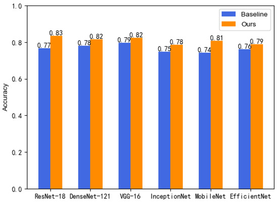 We tested the modules on different backbone networks. As shown in Table 1, the experimental results show that the results increase in different backbone networks by adding the modules. Figure 6 depicts increases in accuracy of 6.65% for ResNet-18, 3.60% for DenseNet121, 2.84% for VGG16, 3.59% for InceptionNet, 6.54% for MobileNet, and 2.61% for EfficientNet. Among them, the optimal result of 83.3% was reached on ResNet-18, and the increase in recall, specificity, and F1 was 2.90%, 3.11%, and 1.75%, respectively.