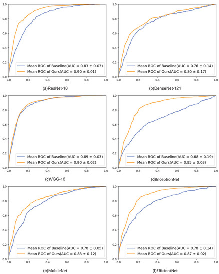 The experimental results are also analyzed using the macro-ROC curves and macro-AUC. As shown in Figure 7, the ROC curves on the six popular backbone networks showed improvements in the results, and the AUC values of our method were all larger than those of the baseline.
