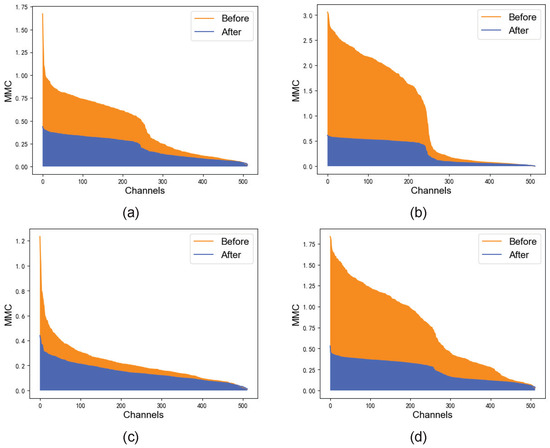 The channel correction module makes the MMC gap of feature maps on each channel smaller by applying a simple function to each channel. The simple function is applied to each channel, which suppresses the high MMC and boosts the low MMC. It smooths out the overall distribution of the channels without altering them, as shown in Figure 8.