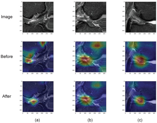 Heat maps of attention before and after attention mechanism. (a–c) show randomly selected MRI images.