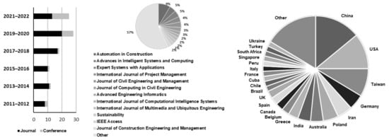 Figure 1 collects the bibliometric results of selected papers. The graph on the left shows an increasing interest in AI-assisted PM since the beginning of Industry 4.0, where the growing tendency for the last two-year period is still notable. The same plot illustrates that there are significantly more journal publications than conference papers in the AI–PM field. However, as depicted in the middle graph, the nature of the journals of the identified works is diverse and multi-disciplinary: they cover management (International Journal of Project Management is the most cited in that discipline), computer science (Expert Systems with Applications and Advances in Intelligent Systems and Computing journals remarkable), construction (Automation in Construction journal on the top), and engineering.