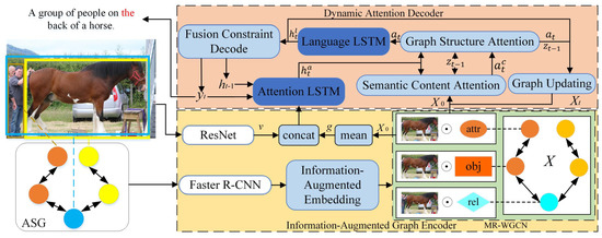 At present, most image captioning models have achieved significant improvement based on the encoder–decoder and reinforcement learning. Inspired by neural language translation, the encoder–decoder structure learns image content with an encoder and transforms the image content into sentences with a decoder. The NIC [17] exploits the convolution neural network to obtain a fixed-length vector representing the content of the whole image and recurrent neural networks to generate words sequentially. Traditional image captioning methods are trained by maximizing the likelihood of ground truth captions, which cannot optimize quality metrics, such as CIDEr. Self-critical Refs. [18,19,20] optimized non-differentiable metrics using reinforcement learning. To reduce the impact of redundant regions in the image, Refs. [21,22] encodes the features of detected object regions [23], and then ground words with relevant image regions dynamically in generation. Except for the detected region, some researchers regard the sentences as the relationships of the objects in the image. The Refs. [24,25,26] adopted the scene graph [27] to utilize the detected objects and their relationships. The ASG2Caption [12] proposed an abstract scene graph (ASG) instead of the detected scene graph to generate the desired caption. This work proposes a novel module called the information-augmented graph encoder, which is composed of an information-augmented embedding module and a multi-relational weighted graph encoder to incorporate a priori information into objects or relation nodes, improving the accuracy and diversity of the generated sentences.