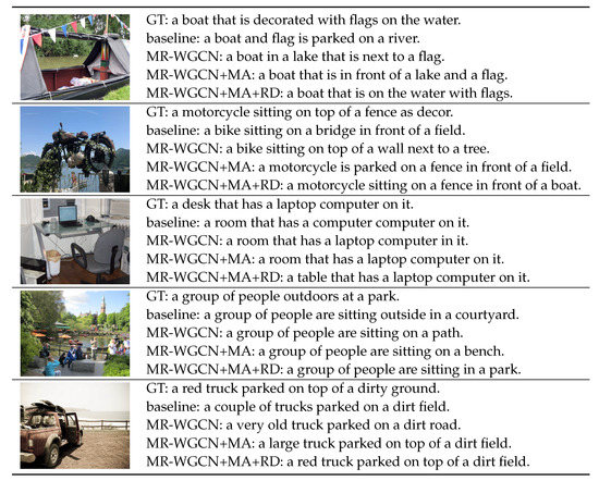 It is obvious that the model with MR-WGCN outperforms the baseline model on five types of accuracy metrics, except B@4. The score for B@4 on MSCOCO Entities is slightly lower than the baseline model by 0.02. In terms of diversity, the results on the MSCOCO Entities dataset are better than the baseline model, but worse on the Flickr30k Entities. This means the MR-WGCN can improve the accuracy of visual words significantly. The reason for MR-WGCN tending to generate similar sentences on small data sets may be the insufficient training data, which makes the MR-WGCN unable to learn the difference between each sentence. Then, we applied the MA module to add the prior information to the “MR-WGCN+MA” model. All evaluation metrics were improved. This means the MA module can steadily improve the accuracy and diversity of the generated sentences. The final model, which adopts the proposed RD module to evaluate the prior information, outperforms the “MR-WGCN+MA” model in all accuracy metrics. For the diversity, the results of the larger dataset are better than “MR-WGCN”, but poor on the smaller one. Compared to the baseline model, better results are achieved for all metrics.