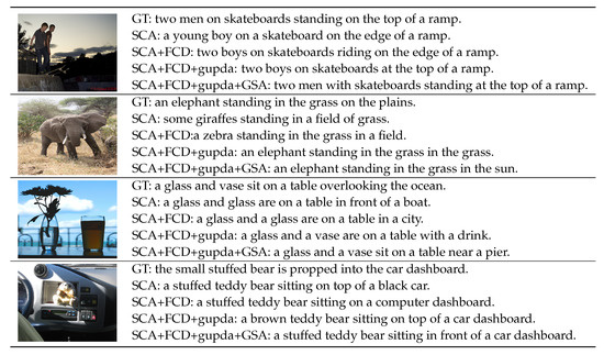 Examples of captions generated by various ablation models. GT represents one of the corresponding ground truth sentences. SCA denotes the model has MR-WGCN, MA, and RD modules, but the decoder only has semantic content attention (SCA). SCA+FCD, SCA+FCD+gupda, and SCA+FCD+gupda+GSA is to add FCD, gupda, GSA modules into SCA step by step.