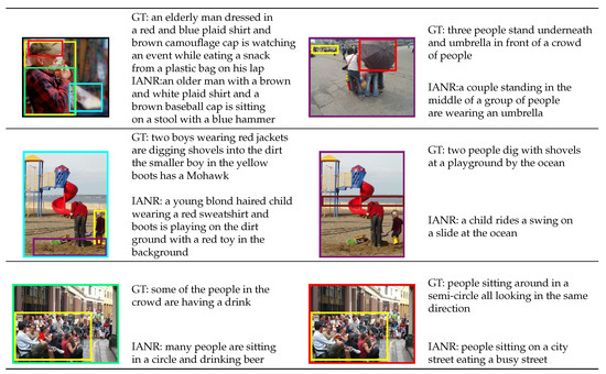 In the experiment, the results of some of the images were not correct. This section visualizes some failure results in Flickr30k Entities, as shown in Figure 4. On the left of the first line, there are too many boxes, resulting in captioning model failure to describe the relationships between them. On the right of the first line, according to the control signal, the model needs to describe populations and umbrellas that do not have relationships. Hence, IANR generates an incorrect description. The left side of the last two lines is the correct sentence and control signal, and the right side is incorrect. In the second line, it is difficult to describe the relationship between the child and the ocean. On the right side of the third row, the red box contains two boxes indicating a semicircle and the same direction, respectively, which is too close and makes the model difficult to describe.