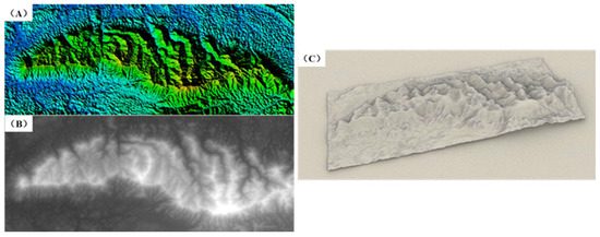 (A) DEM data; (B) grayscale image; and (C) Rhino surface model.