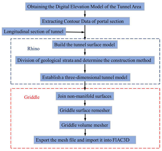 This study adopted the Rhino–Griddle joint modeling method, in order to realistically reflect the complexity and irregularity of the terrain, consider the ground stress in the bias state, and reduce the modeling error. The three-dimensional tunnel model was developed through the tunnel topographic contour, longitudinal cross-section, digital elevation model (DEM), and profile of the portal section. In this study, the satellite image has a pixel size of 35,420 × 36,421 and a spatial resolution of 2.3818 m/pixel; the DEM was derived from the PALSAR sensor of ALOS with a resolution of 12.5 m, a pixel size of 4428 × 4553, and a spatial resolution of 4.77731 m/pixel. The co-ordinates of both are the WGS-84 co-ordinate system (World Geodetic System 1984 Co-ordinate System). First, the grayscale image was obtained by DEM. The grayscale image is a common form of elevation representation, which uses a linear function to transform the original elevation range into the grayscale color range, dividing the white and black into a number of levels according to the logarithmic relationship between them. The 8-bit grayscale image is represented from 0 to 255; the larger the elevation, the closer to white, and the smaller the elevation, the closer to black. The grayscale image can be used to quickly and completely generate the topography of the tunnel area in line with the realistic terrain. The effects are shown in Figure 2. Subsequently, the area of the tunnel portal section was determined by the latitude and longitude co-ordinates and construction design drawings; the area was divided, and the topographic information such as the geological longitudinal section, portal section profile, and topographic contours were used to adjust the model surface. Then, the zone units were divided according to the rock layers and construction methods, and the complete three-dimensional model was established after stretching and exported to FLAC 3D through the interface software. This model was consistent with the actual topography and realized the refined modeling of the entrance section of the Guanyin Mountain Tunnel. The modeling process is shown in Figure 3.