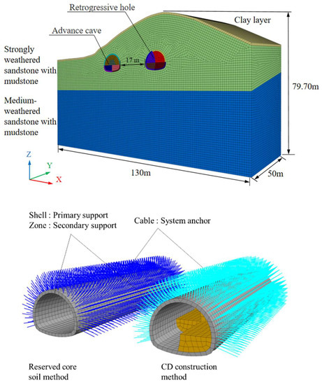 The anchor structure were simulated by the cable elements; the action of the anchor structure with the surrounding rock is defined by geometric parameters, material parameters, and cement slurry characteristics, which are mainly taken from the Shuikou–Chongzuo–Aidian Highway (Chongzuo to Aidian Crossing Section) Two-Stage Construction Drawing Design. The anchor rod calculation parameters are based on a 25 mm-diameter and 5.5 mm-thickness hollow grouting; the length of the anchor rod for the arch and side wall are 4 and 6 m, respectively. The anchor rod elastic modulus is 200 GPa, density is 7850 Kg/m3, and tensile strength 0.2 MN; the installation hole diameter of the anchor rod Dc is 42 mm and thickness of slurry ring t = 8.5 mm, so the cross-sectional area of the anchor rod is 490.9 mm2, and perimeter of the cement slurry outer ring is 0.139 m. M20 cement mortar is selected; its shear modulus is 9.5 GPa, friction angle is 25°, shear strength peak τpeak = 0.86 MPa, and the unit length mortar stiffness and Mortar bonding force were calculated by Equations (8) and (9) [28]: