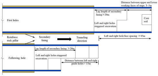 (3) The excavation sequence of the tunnel in the shallow-buried eccentric-pressure section was suggested to adopt the method of excavating the left tunnel first and then the right tunnel. If the right tunnel was excavated first, the slope stability would continue to decline and be in a critical safety state when the left tunnel was excavated due to the disturbance of the rock mass on the right. If the left tunnel is excavated first, the support measures can be changed in time according to the change of the slope, and in the process of excavating the right tunnel, it was safe for the slope because it was not affected by the eccentric pressure. The initial support is applied in time after the tunnel excavation so that the support forms a closed structure, which can improve the safety of the construction environment