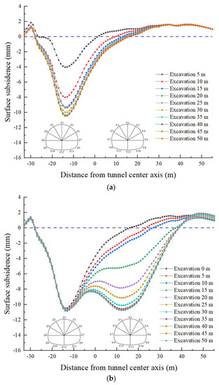 Surface settlement curve: (a) surface settlement of the left tunnel excavation; and (b) surface settlement of the right tunnel excavation.