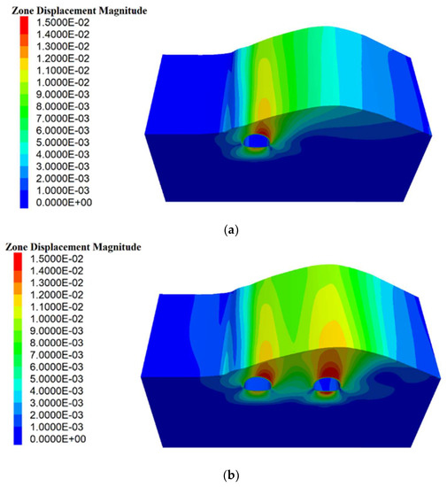 Contours of the tunnel displacement: (a) excavation of the left tunnel; and (b) excavation of the right tunnel.