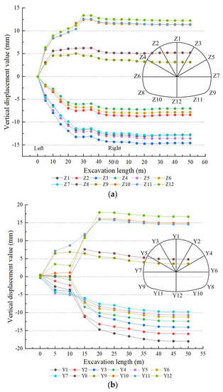At the end of the right tunnel excavation, the surrounding rock deformation was symmetrically distributed, indicating that it was not affected by the eccentric pressure, and the excavation of the right tunnel had little effect on the deformation of the surrounding rock of the left tunnel. As the overlying rock layer of the right tunnel was thick, the settlement and uplift values were greater than those of the left tunnel. The maximum settlement value was found as 17.952 mm, and the maximum uplift value was 16.748 mm, appearing in the arch crown and the center of the inverted arch, respectively. As shown in Figure 9b, the short-term displacement of the surrounding rock changed significantly after each step of rock and soil excavation. Most of the surrounding rock deformation reached stability when the excavation reached 20 m. After the tunnel excavation was completed, vertical displacement contours were intercepted vertically at the center of each tunnel along the tunnel axis direction. Five monitoring points were arranged along the axial direction at the arch bottom of each tunnel, and the change curve of vertical displacement of each monitoring point was obtained, as shown in Figure 10 and Figure 11.
