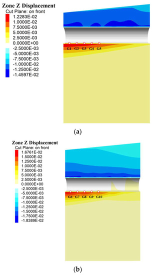 Contour of vertical displacement of tunnel section: (a) the left tunnel; and (b) the right tunnel.