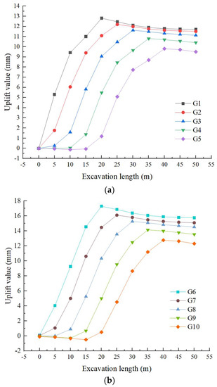 As shown in Figure 10 and Figure 11, from the stratigraphic distribution, due to the tunnel passing through a rock stratum with a different weakening degree, although the deformation at the top of the surrounding rock is the same, the uplift area at the bottom of the surrounding rock is not unevenly distributed along the axis, and the uplift value gradually decreases. From the changes of the curves, it can be seen that the uplift value of the arch bottom had a similar trend and tended to stabilize after the excavation surface advanced 20–25 m. The uplift value of the tunnel front-end was larger than the tunnel back-end. Due to the greater burial depth of the right tunnel, the uplift value of the right tunnel was larger than that of the left tunnel. After the secondary lining was applied, the uplift values at all monitoring points decreased slightly. Therefore, it is necessary to consider that the inverted arch design of the tunnel in the strongly weathered rock area and the right tunnel is strengthened, and the initial support is applied in time after excavation.