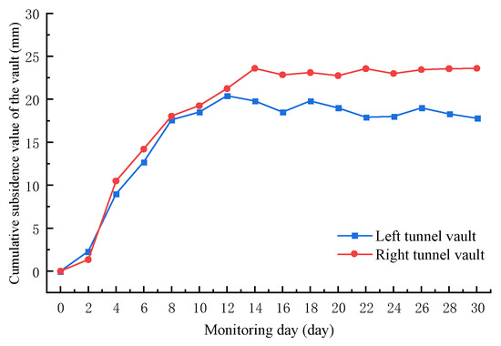 Cumulative subsidence temporal curve of the vault at the tunnel portal section.