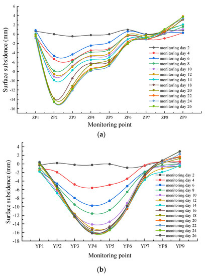 Surface subsidence temporal curve at tunnel portal section: (a) the left tunnel; and (b) the right tunnel.