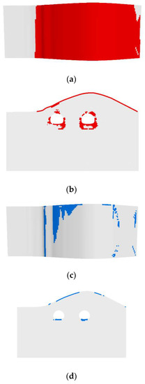 Distribution of different plastic zones: (a) distribution of shear plastic zone on the slope surface; (b) distribution of shear plastic zone of the surrounding rock; (c) distribution of tension plastic zone on the slope surface; and (d) distribution of tension plastic zone of the surrounding rock.