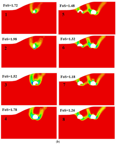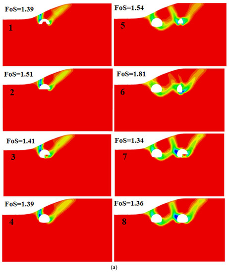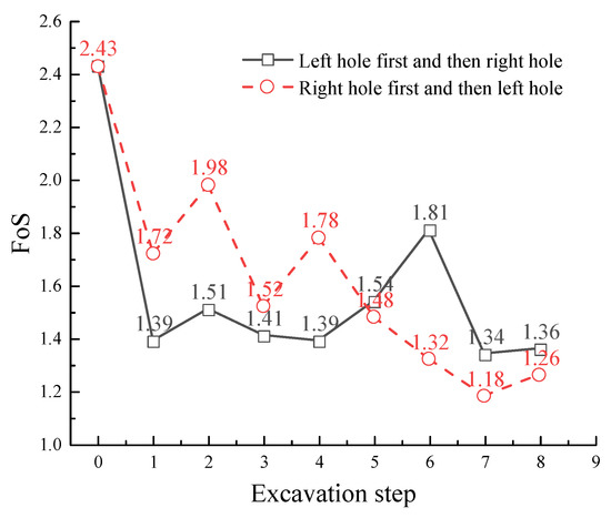 As shown in Figure 15 and Figure 16, The initial safety factor for the unexcavated phase of the tunnel was the highest, at 2.43. The overall safety factor of the slope decreases as the tunnel progresses, while the initial support improves the stability of the slope to some extent. When the left tunnel was excavated first, the potential slip area was primarily situated between the left side of the excavation area and the area closest to the surface and on the right side of the tunnel. Then, when the right tunnel was excavated, the slip area of the left tunnel was moved down to the arch foot and connected with the right tunnel to form a larger slip area. When the right tunnel was excavated first, the influence was small because the tunnel was farther away from the slope. Figure 16 shows that only the right tunnel was excavated with a higher safety factor than when only the left tunnel was excavated. The rock excavation of the upper half under the CD method caused a large disturbance to the surrounding rock, which directly led to a large float of the slope safety factor, while the excavation of the lower half caused a relatively small disturbance to the surrounding rock, which was due to the initial support and temporary support forming a closed structure, which improved the stability of the slope; thus, advanced support should be applied before the excavation of the upper part of the tunnel, and the initial support should be applied in time after the excavation. However, due to the influence of the right tunnel excavation, the factor of safety of the slope decreased rapidly when the left tunnel was excavated, and the stability of the slope was slightly improved until the left tunnel supporting structure formed a closed structure. It can be seen that the initial support applied in time after the tunnel excavation can improve the safety of the construction environment. In the whole simulation process, the minimum safety factor was 1.18, so it was recommended to excavate the left tunnel first and then the right tunnel during construction.