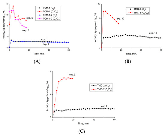 In the case of ethylene–1-hexene copolymerization over TMC-1, TMC-1-2, and TMC-3 catalysts (Figure 1A,B), a high initial activity followed by a considerable decrease in polymerization rate was observed. In the case of copolymerization over TMC-2, the activity sharply increases in the initial period (10 min) until a stable level is achieved (Figure 1C). It was supposed [29,30,31] that the increase in activity of different catalysts in the copolymerization of ethylene with α-olefin relative to the homopolymerization of ethylene may be associated with the higher concentration of monomers on the surface of catalysts. This effect was explained by an increase in the portion of amorphous material in the produced copolymers in comparison with homopolyethylene, which has a higher crystallinity. As seen in Table 2, indeed, all the copolymers of ethylene with 1-hexene have a lower crystallinity (26–47%) with respect to PE (60–66%) and a lower melting point of the crystalline part.