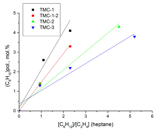 To estimate the copolymerization ability of various TMCs, copolymerization constants (r1) were calculated from the dependence of the content of the comonomer (1-hexene) in the polymer on the molar ratio of monomers in the reaction medium (heptane) using Equation (1):