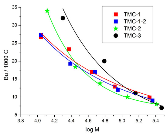 According to the data presented in Figure 2 and Table 2, which corresponds to the inverse r1 value, the copolymerization ability changes in the following series of catalysts: TMC-1 > TMC-1-2 > TMC-2 > TMC-3.