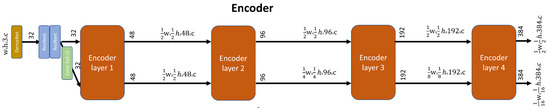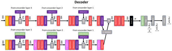 In the decoder (Figure 8), simple depthwise convolutions without a bottleneck are used. After applying an attention mechanism (Figure 6), skip connections coming from layers 5, 4 and 3 are fused with the decoder layers 1, 2 and 3, respectively, concatenating over the feature dimension of each branch. In every decoder layer, the second branch is upsampled until the size of the first branch is achieved in the last decoder layer, just before both branches are fused together using an attention mechanism. The attention mechanism assigns an attention, which establishes how important each pixel is and provides a criterion for fusing two images together.