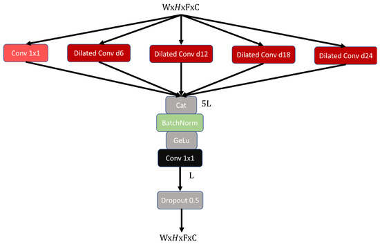 A dilated or atrous convolution is an image convolution with spacing between the values in the kernel so that the field of view is widened, as shown in Figure 2. These convolutions are the basis for the spatial atrous pyramid layer [29]. This consists of applying a series of dilated convolutions with various dilation rates over the input and subsequently concatenating all outputs over the feature dimension. This gives the network a more global understanding of the image.