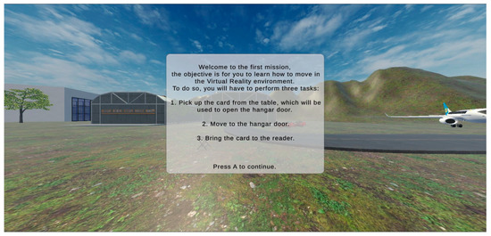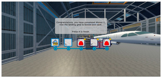 The first challenge is designed as a training scene, where an introduction to the virtual environment and its main interactions are presented. In order to become acquainted with the application management, the user has to move outside the hangar area, reach the specific hangar door, pick up a card, and open the door by using it. The second mission is already carried out inside a hangar where the user has to secure the landing gear by performing the landing gear downlock pins installation maneuver. The third mission consists of protecting the aircraft’s temperature and altitude sensors with protective hoods. Therefore, users have to use a ladder that facilitates access to them. For the last two missions, the narrative changes; instead of receiving the landing of the plane, the user has to prepare it for take-off. In the fourth mission, the landing gear pin has to be removed, and, finally, in the fifth mission, the objective is to uncover the sensors.