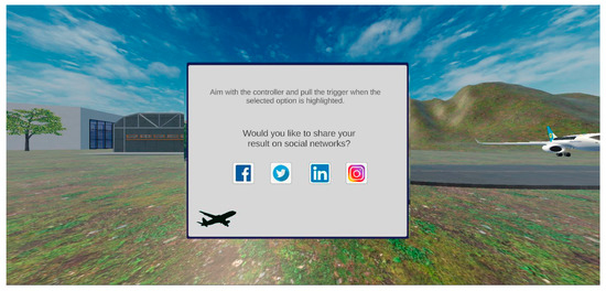 Figure 3. Connection with social networks to share user achievements. - Ownership and Possession: The ownership feature is the one that is identified with the possession of goods or benefits of the user in the application. Some prizes were designed to accomplish this driver. They are a set of collectible miniatures of airplanes that are obtained by the user once per every task successfully performed (Figure 4). As the user overcomes different challenges, such as successfully completing the initial tutorial, a 3D model of a specific plane is unblocked, losing its initial red color, and it is offered on the table that contains the collection. Aircrafts representing missed or failed tasks are colored in red to motivate the user to repeat missions or perform new activities in order to obtain the complete collection.