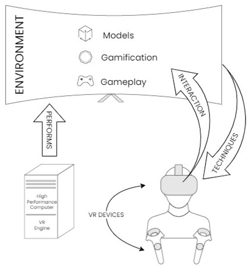 As shown in Figure 8, the system runs on a high-performance computer that supports the game engine. Once launched, the environment presents the models, with the gamification and gameplay designed, allowing the user to interact through VR devices. This interaction makes the system present the different challenges of the experience, providing them with greater knowledge about the techniques described.