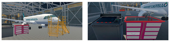 The tasks necessary to carry out the maintenance of the aircraft were determined by the staff of Castelló Airport (Aerocas). With the purpose of providing students with the opportunity to practice with experiences close to reality, the entire real-world environment was replicated. Figure 9 shows samples of the result.