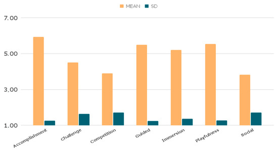 The first hypothesis of the study states that the gamification of the environment motivated its use in training practices related to aircraft maintenance. To evaluate this information, the Gamefulness Questionnaire was used. Figure 11 shows the results obtained after the evaluation, including the mean and the standard deviation of the data.
