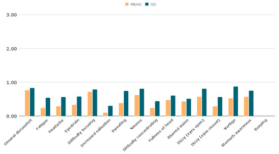 The Simulator Sickness Questionnaire (SSQ) [30] provides a quantitative measure of the severity of simulator sickness symptoms through 16 items, each rated on a 4-point scale ranging from 0 (none) to 3 (severe). The detail of this questionnaire is included in Appendix B. The 16 items belong to three types of symptoms: nausea, oculomotor, and disorientation. The minimum possible score is zero being the best-case scenario. SSQ indicates an adequate internal consistency (Cronbach’s alpha of 0.7) [31].