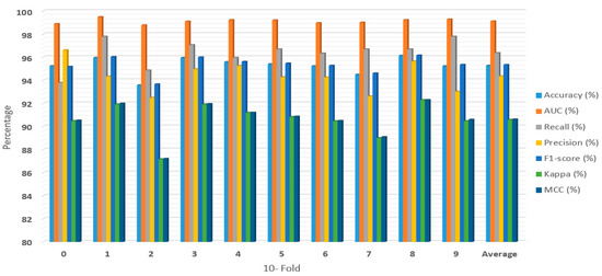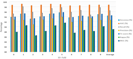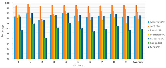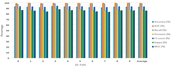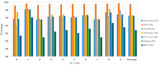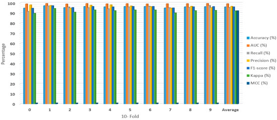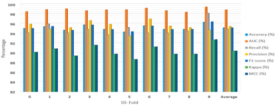 Figure 2, Figure 3, Figure 4 and Figure 5 showed the first experiment’s results. In this experiment, we evaluated the RF, XGBoost, LightGBM, and RXLM with measurement metrics before hyper-parameters optimization. The ensemble RXLM had 96.08%, 99.2%, 95.5%, 96.65%, 96.06%, 92.16%, and 92.2% for accuracy, AUC, recall, precision, F1-score, Kappa, MCC, respectively. The RF had 94.49%, 98.84%, 96.56%, 92.73, 94.6%, 88.98%, and 89.06% for accuracy, AUC, recall, precision, F1-score, Kappa, MCC, respectively. The XGBoost achieved 95.29%, 99.13%, 96.38%, 94.36%, 95.35%, 90.59%, and 90.63% for accuracy, AUC, recall, precision, F1-score, Kappa, MCC, respectively. The LightGBM achieved 94.82%, 98.89%, 96.19%, 93.64%, 94.89%, 89.64%, and 89.69% for accuracy, AUC, recall, precision, F1-score, Kappa, MCC, respectively. The accuracy of the RF, XGBoost, and LightGBM was 94.49%, 95.29%, and 94.82 %, respectively. The accuracy, precision, F1-score, Kappa, and MCC of ensemble RXLM were the highest, at 96.08%, 96.65%, 96.06%, 92.16%, and 92.2%, respectively. The XGBoost achieved the highest AUC, at 99.13%. The RF achieved the highest recall, at 96.56%. The RF had the lowest accuracy, AUC, precision, F1-score, Kappa, and MCC, at 94.4%, 98.84%, 92.73%, 94.6%, 88.98%, and 89.06%. The RXLM had the lowest recall, at 95.5%.