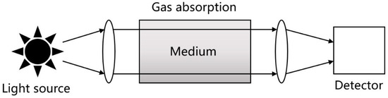 In addition to the monitoring systems developed by individual companies, many researchers have investigated methods for the simultaneous monitoring of pollutants such as SO2, NOX, CO, and PM. Jieshu Zou et al. [43] innovated from the monitoring principle, improved and innovated the traditional DOAS, and developed a new measurement method, called GP-DOAS (Gas & Particle Differential Optical Absorption Spectroscopy) for simultaneous measurement of gas and particle pollutant concentrations, which can be used for simultaneous measurement of SO2, NO2, and PM concentrations. The principle of conventional DOAS is that a light beam transmitted in a medium interacts with the medium. When the medium is some kind of gas and the beam is transmitted in the optical path, the variation in its radiation intensity can be expressed by the Lambert–Beer law. Additionally, according to the Lambert–Bier law, the concentration of the gas can be measured, and the basic principle is shown in Figure 2.