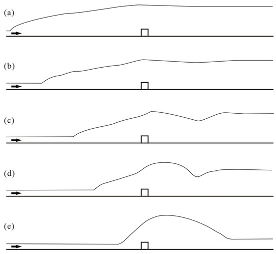 A hydraulic jump is a phenomenon that occurs by converting supercritical to subcritical flow regimens downstream of hydraulic structures. Hydraulic jumps mostly occur in stilling basins with sills or blocks after the sluice gates or weirs. For a sill-controlled stilling basin, the flow passing over the sill changes with the supercritical Froude number, and the relevant hydraulic characteristics (i.e., the hydraulic jump performance) are strongly influenced by the position and height of the sill [1,2,3,4]. In the stilling basin, hydraulic jumps can be classified successively into five types—namely A, B, minimum B, C, and wave-type flow—as the tailwater decreases, as illustrated in Figure 1 [5]. The A-jump corresponds practically to a classical jump as the sill position is at the end of the surface roller, and the sill has no effect on the jump (Figure 1a). The B-jump occurs when the tailwater depth decreases, the jump toe moves toward the sill and the deflection of the bottom stream occurs (Figure 1b). Consequently, the minimum B-jump is the formation of a second roller at the downstream of the sill and a C-jump forms when the maximum difference between the flow depth over the sill and the tailwater depth is realized (Figure 1c,d). As the tailwater is gradually reduced, eventually reaching the point of no tailwater, a wave-type flow will occur in the vicinity of the sill, and the resulting downstream flow is characterized by supercritical flow conditions. Distinct from other types of flow, wave-type flows result in excessive standing waves and highly erosive supercritical flow downstream of the sill; thus, this type of flow should be generally avoided (Figure 1e). In the design of stilling basins or energy dissipators, it is very important to make sure that a hydraulic jump occurs for all possible tailwater depths. Thus, according to the practical engineering design of the sill-controlled stilling basin (i.e., an abrupt bottom rise), wave-type flow inevitably occurs when there is no tailwater [6,7].