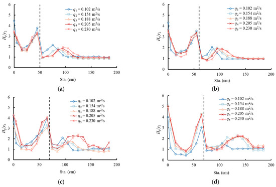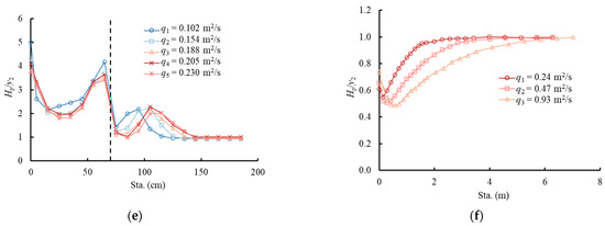 Figure 8 illustrates the normalized mean pressure heads (Hp/y2) along the stilling basin at different unit discharges (qws) for each case and a CHJ. In this figure, the downstream flow depth, y2, was used to normalize Hp. In general, the streamwise dimensionless mean pressure heads Hp/y2s for each case (Figure 8a–e) exhibited a similar trend at different unit discharges, with two distinct peak values observed along the stilling basin. For a CHJ in Figure 8f, Hp/y2 typically decreased initially and then increased along the stilling basin. A larger Hp/y2 could be obtained for a smaller qw until the end of the jump, except for the beginning of the stilling basin. According to the existence of pressure peaks and the sill position in Figure 7 and Figure 8, the streamwise dimensionless mean pressure indicated the following flow zones: (1) deflection zone, (2) jump zone, and (3) wave impact zone.