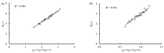 The graphs of Equations (2) and (3) are plotted in Figure 9. Equations (2) and (3) also reflected the relationships among the peak pressure heads, inflow conditions, and the sill configurations; i.e., the relative peak pressure increased with an increasing F1 and the relative length of the stilling basin ls/y1 but decreased with increasing sill height s/y1.