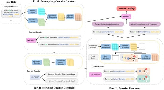The rest of this paper is organized as follows: Section 2 presents the related work on KGQA tasks. We first describe the general structure of the model in Section 3 then introduce the three sub-models for question decomposition, constraint extraction, and question reasoning. The experimental Section 4 presents numerous experimental findings and ablation studies are conducted to support the model’s validity. The conclusions and accompanying prospects are presented in Section 5.