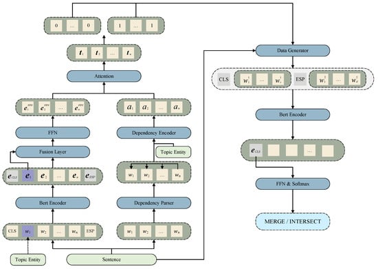 The model’s input is divided into two parts: sentence information and topic entity information. The sentence is denoted as , where denotes the ith word in the sentence and n denotes the number of words. S will be encoded in parallel by the semantic encoder and the dependency encoder. The topic entity in this sentence guides the semantic encoder and the dependency encoder in information selection.