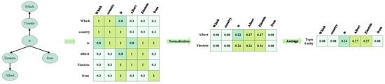 Dependency matrix generation example, where and . For the sentence “Which country is Albert Einstein from”, there is a weak dependency between “is” and “Albert” and a strong dependency between “is” and “from”. After generating the dependency matrix, we need to select the vectors corresponding to this topic entity, normalize the vectors by rows, and then average them by columns.
