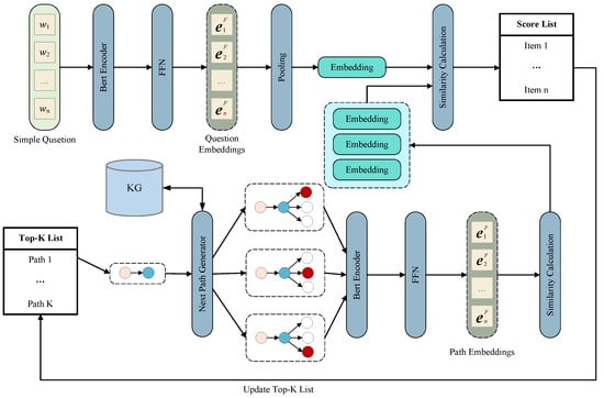 In this section, the aim is to build the correct query graph in the knowledge network based on the simple question generated by the question decomposition, where is the optimal path to the answer and is the constraint. Based on the question information, we propose the HBHR model to perform hop-by-hop reasoning to determine the optimum path . The model is made up of four components, including question encoding, path encoding, similarity computation, and path generation. Figure 5 depicts the model structure.