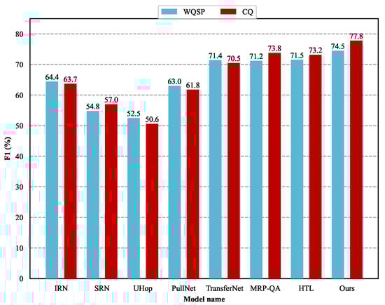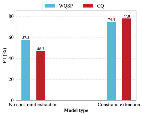 In this section, the constraint extraction model and the question reasoning model are evaluated as a whole and compared to other baseline models on WQSP dataset and CQ dataset, respectively, with the findings presented in Figure 6. The figure shows that the values of the proposed model outperform the baseline models on both datasets, by 74.5% and 77.8%, respectively.