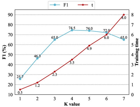 Figure 7 demonstrates that the model’s performance increases and subsequently decreases with the increase of K value, with the value being the highest when K is 4. This is because when K is 1, the model can only keep the current optimal path and loses the ability to explore potential optimal paths, making it easy to find suboptimal solutions, whereas when K is too large, an excessive number of paths are kept at the end of each cycle, and many of these paths are suboptimal or incorrect solutions, causing significant interference to the search algorithm. The figure also shows that the training time increases rapidly as K increases.