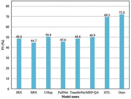 SRN is a weakly supervised model that ignores the relations’ overall semantic information. Both IRN and UHop are relational supervised models that neglect the local information of the relations, and both use a delayed termination mechanism that does not adequately filter the information during the hop-by-hop updating of the questions. PullNet and TransferNet are designed to be able to use both documents and knowledge bases as knowledge sources, and because only the knowledge graph is employed as the information source in this experiment, the effect would be affected. For MRP-QA, although it uses multi-paths reasoning, when the number of hops increases and the constraint relations become complex, it instead performs worse than our proposed model due to the increased choice of paths. Because the knowledge base schema was not incorporated as inputs during the Hereditary Tree-LSTM training, HTL is difficult to identify between distinct multi-hops.