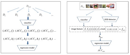 Left: The training process of the regression model. We first generate a set of transformed datasets from the training set and use the information from transformed datasets to train the regression model for predicting model accuracy. Note that in these transformed datasets, the mask of the images is always set to 1 because the labels of these images have not changed and still belong to the original distribution. Right: We use the trained regression model to predict the accuracy of the model, and the image shown in the red box indicates out-of-distribution (OOD) data. To avoid the impact of these OOD images on the prediction of the regression model, an OOD detector sets the mask of the corresponding features of the image to 0.