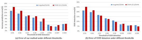 (a): The vertical axis represents the error between the model accuracy predicted by our method and the true accuracy of the classifier, while the horizontal axis represents the OOD detection threshold. This error decreases initially and then increases as the OOD threshold increases. (b): The vertical axis represents the error of OOD detection, while the horizontal axis represents the OOD detection threshold. This error decreases as the OOD threshold increases. The ID/OOD data in the dataset comes from CIFAR-10.1/ImageNet and ImageNet/SVHN, respectively. The ratio of ID data to OOD data is 9:1.
