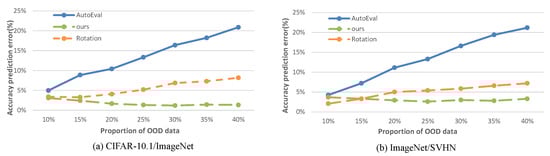 Data-centric AutoEval. The main purpose of the data-centric AutoEval [5,10,11,26,27] is to predict the accuracy of the model on an unlabeled test set. Ref. [2] presented an unsupervised framework that used only unlabeled data and mild assumptions to estimate the error rates of the classifier. Ref. [6] demonstrated a strong linear relationship between classification task accuracy and rotation prediction task accuracy. Refs. [3,4] used training sets to generate meta-datasets and to predict model accuracy through dataset representation. Ref. [11] found a relationship between the difference of confidences (DoC) of a classifier’s predictions and classifier performance on unlabeled datasets. However, none of these methods consider the effect of OOD data on accuracy prediction. We use the AutoEval method with OOD detection to minimize the impact of OOD data and to improve AutoEval performance.